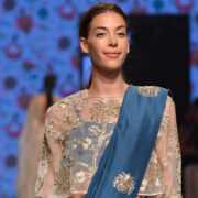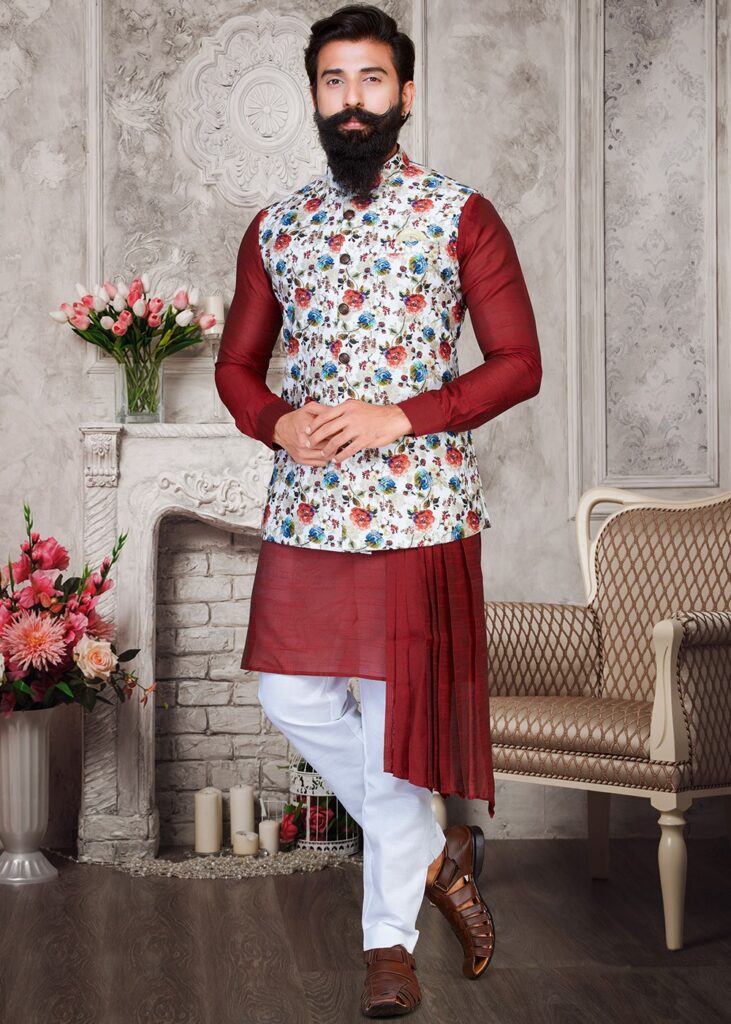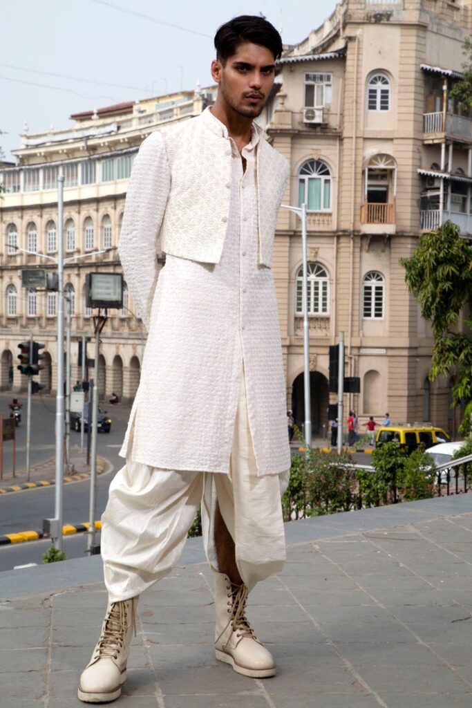 You may wonder that a Nehru jacket is something quite common. What adds the edgy element is when you pair it with an asymmetric kurta and formal white trousers.
