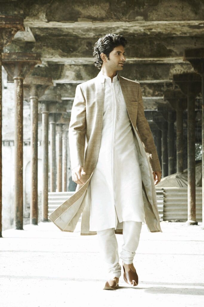 Jackets have been in trend for quite some time, however, the longer ones is what we are focussing on for the grooms. A simple white embroidered kurta teamed with a long khadi coloured open jacket is sure to turn heads at the party. Not to forget the classic tan brown jutis to go with the ensemble.