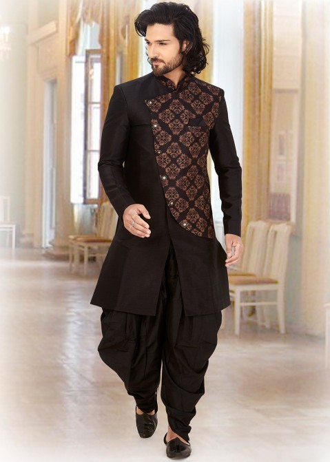 Gone are the days when Black was considered an inauspicious colour. Bust the myth and rock the dance floor in a side buttoned Black jacket teamed with Black pyjamas and a matching juti.